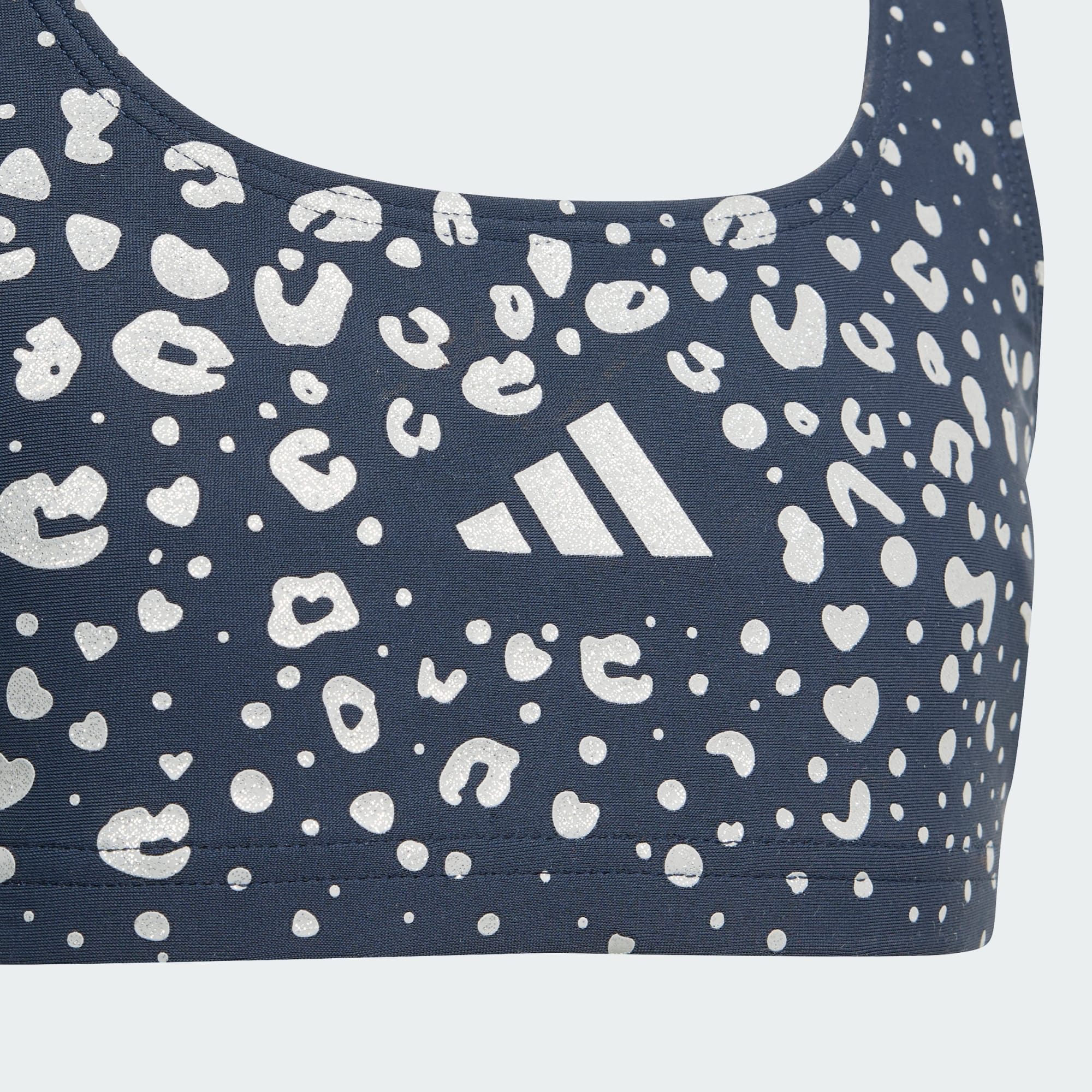 V těchto dětských bikinách adidas může vaše malá plavkyně vyjádřit svou individualitu v bazénu i mimo něj. Design s vykrojenými zády jí umožní plný rozsah pohybu. Stříbrný potisk a třpytivé logo 3 proužků dodávají bikinám lesk.