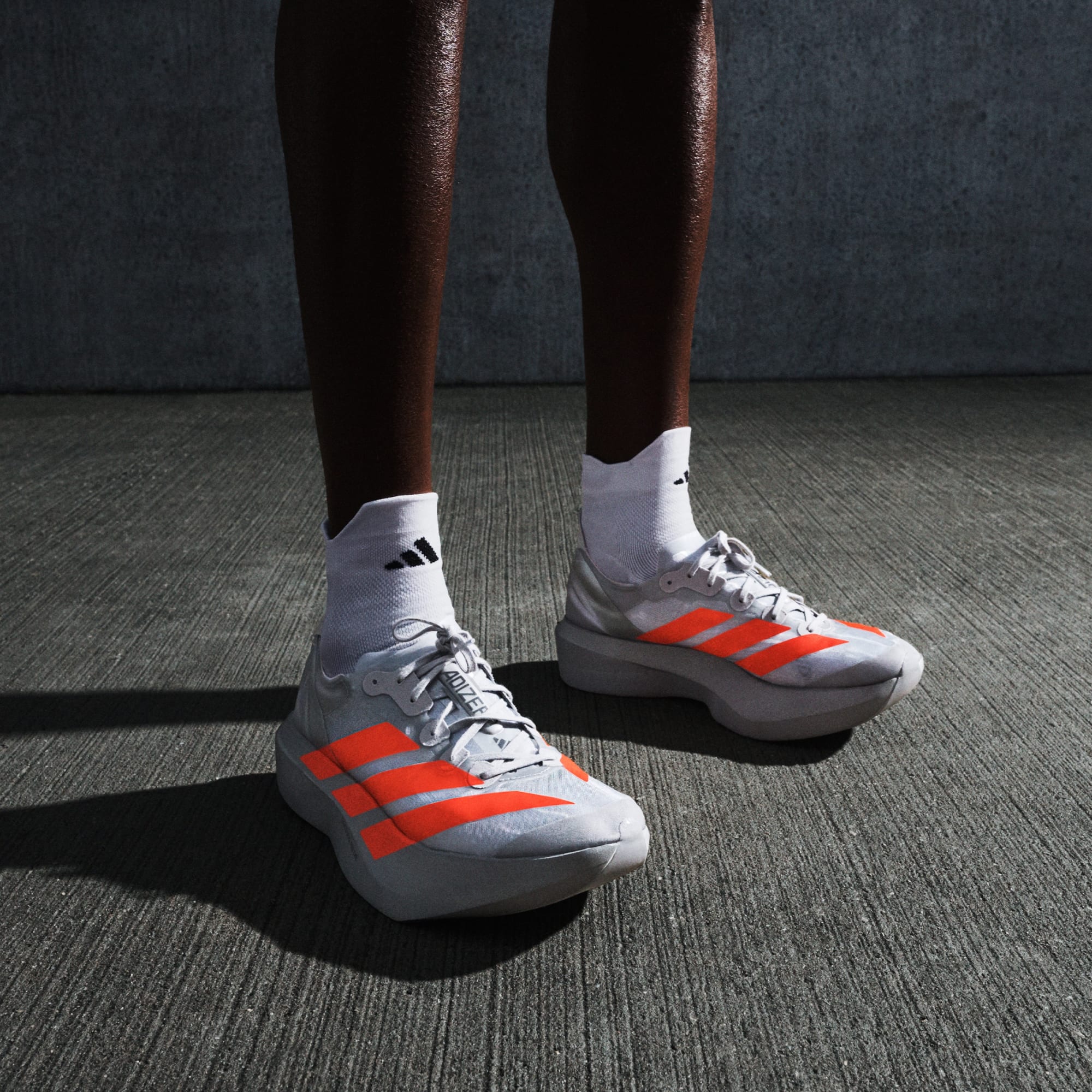 An image of runner's legs astride in an urban scene, wearing the new Adizero Adios Pro Evo 2 shoe.