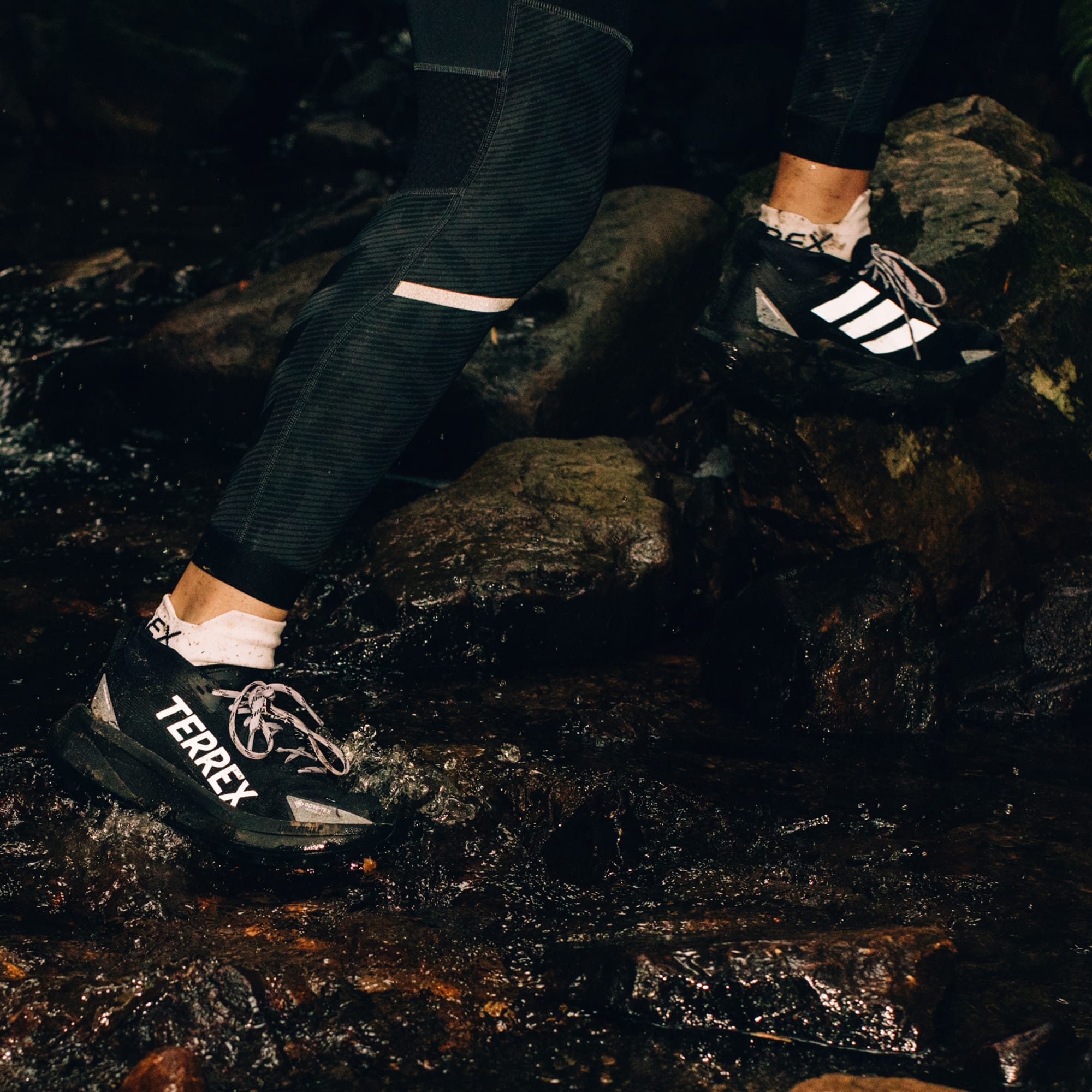 Na obrázku jsou černé turistické boty adidas Terrex na oranžovém a černém pozadí a na botách je zdobí výrazné logo Terrex.