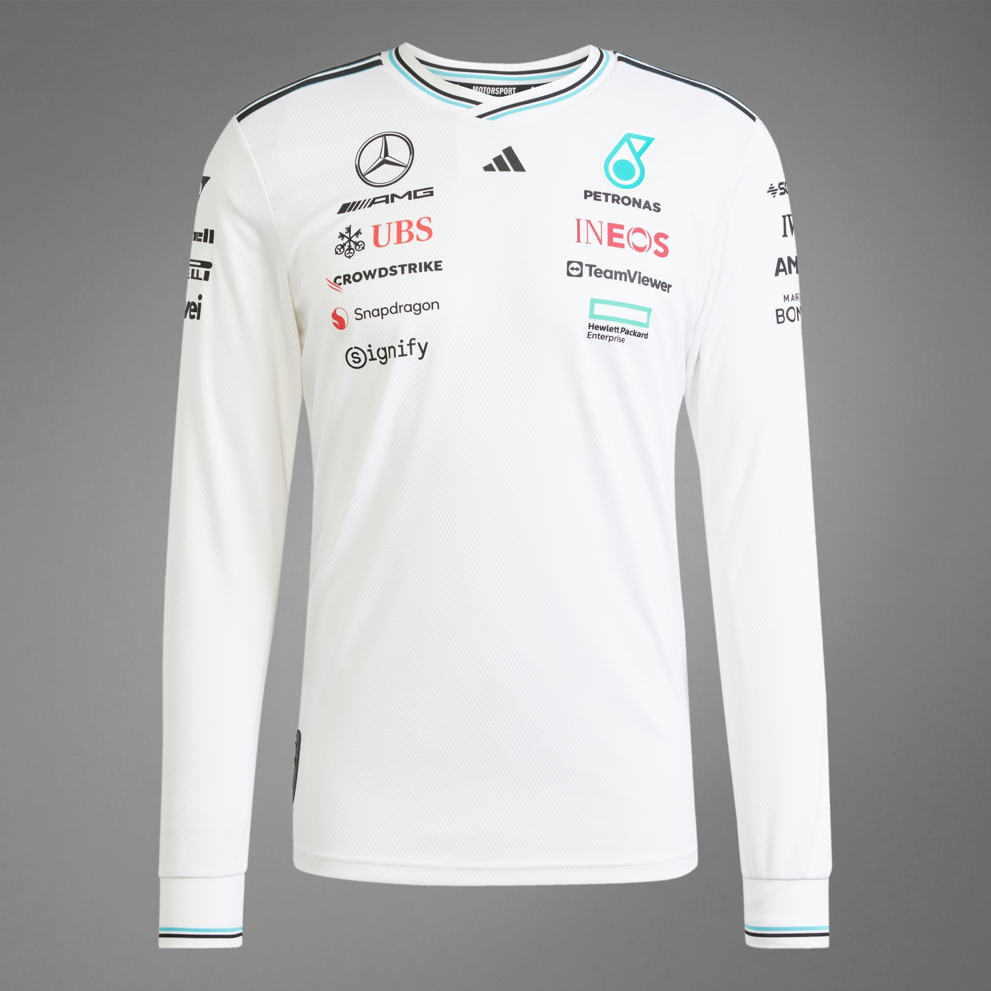 V tomto autentickém dresu Mercedes - AMG Petronas Formula One Team si budeš připadat jako součást týmu adidas Motorsports. Elegantní střih s dlouhým rukávem ti dodá elegantní vzhled. Dres je vyrobený ze savého materiálu AEROREADY, který tě udrží v suchu a pohodlí na trailu i doma na gauči. Celkový vzhled dotváří týmová loga a loga sponzorů.