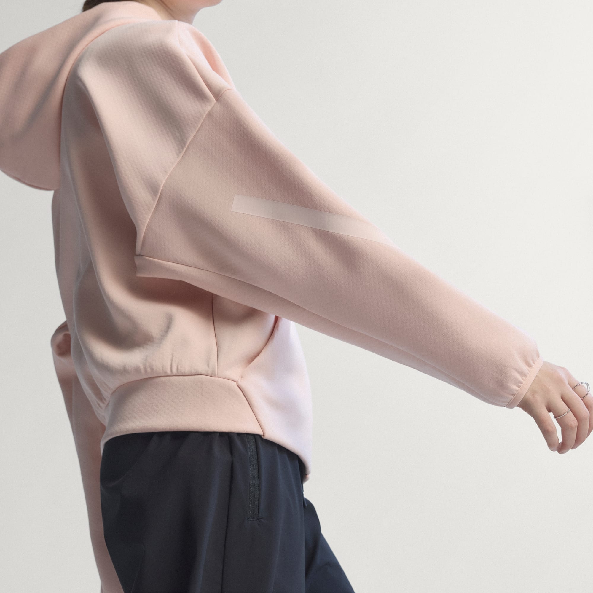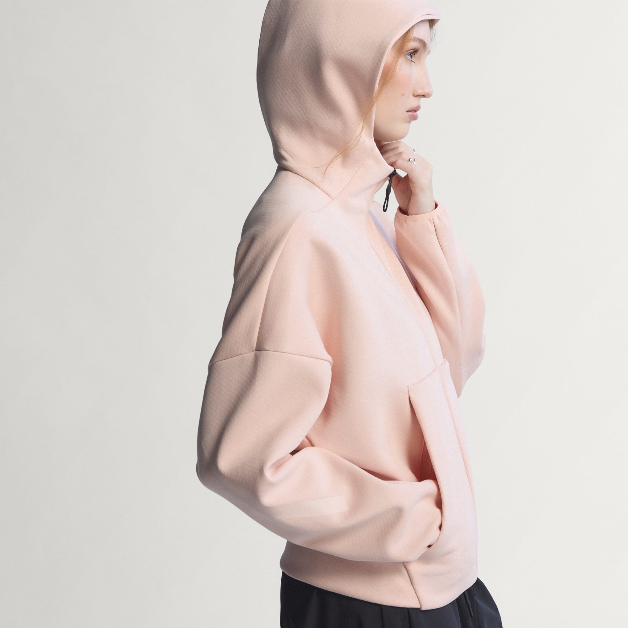 Sportovní mikina s kapucí vyrobená částečně ze směsi recyklovaných a obnovitelných materiálů.