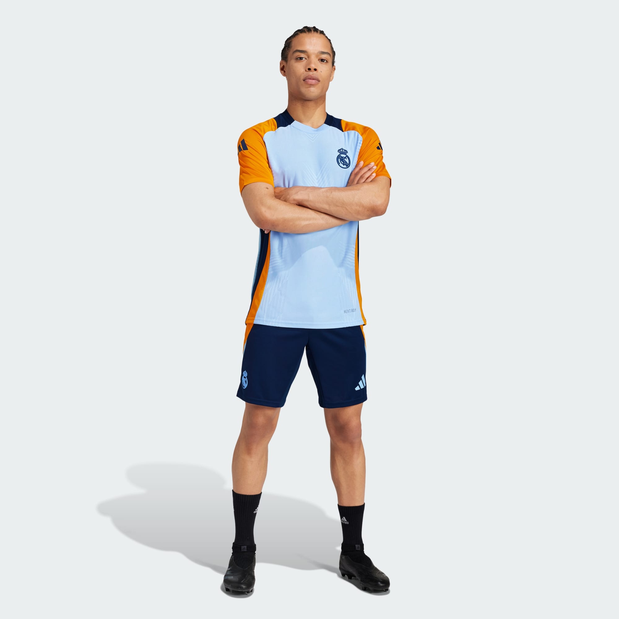 No training session is too challenging when you're in the right kit. Part of the range-topping training gear adidas supply to Real Madrid, this football jersey fields HEAT.RDY to keep you cool as the intensity ramps up. The slim fit and stretchy jacquard fabric ensure nothing slows you down until you're heading back to the changing rooms.This product is made with 100% recycled materials. By reusing materials that have already been created, we help to reduce waste and our reliance on finite resources and reduce the footprint of the products we make.