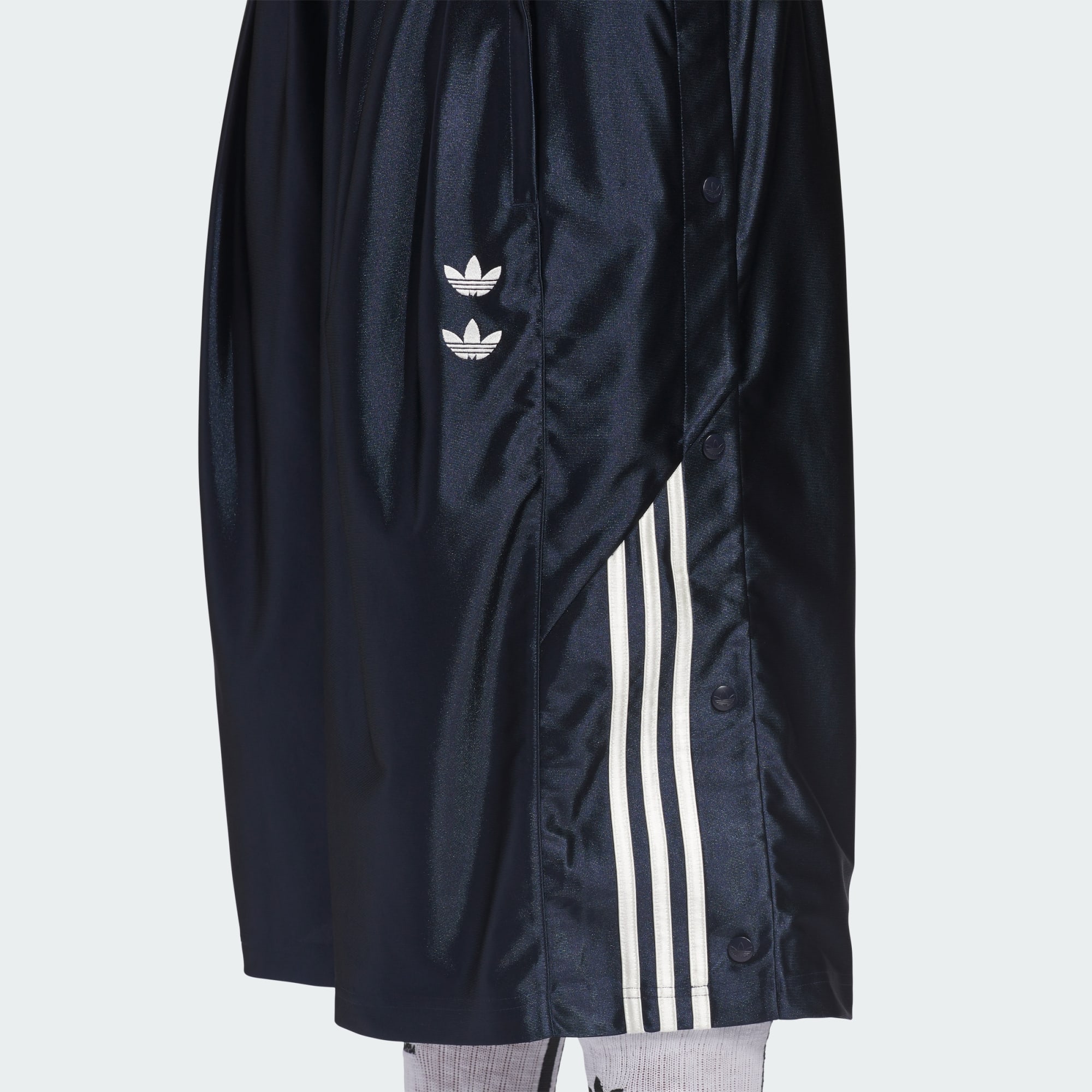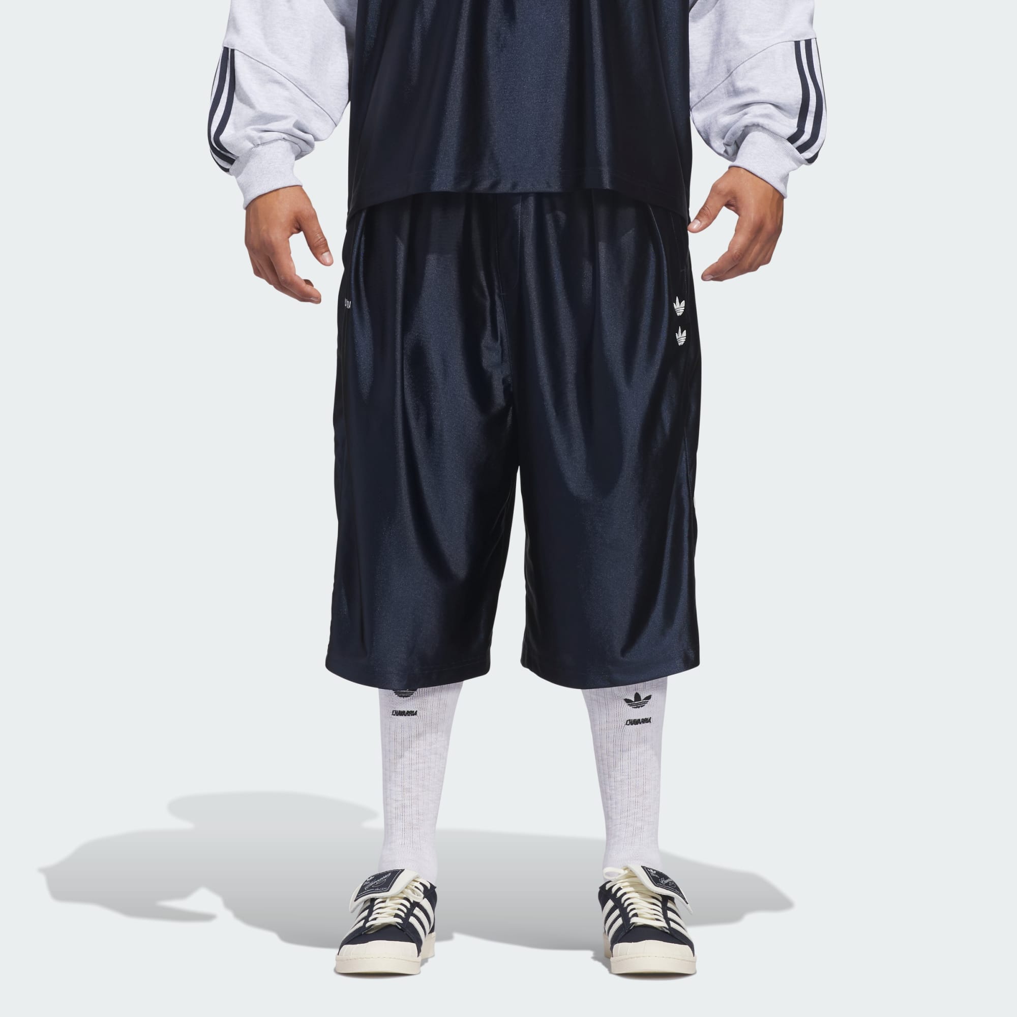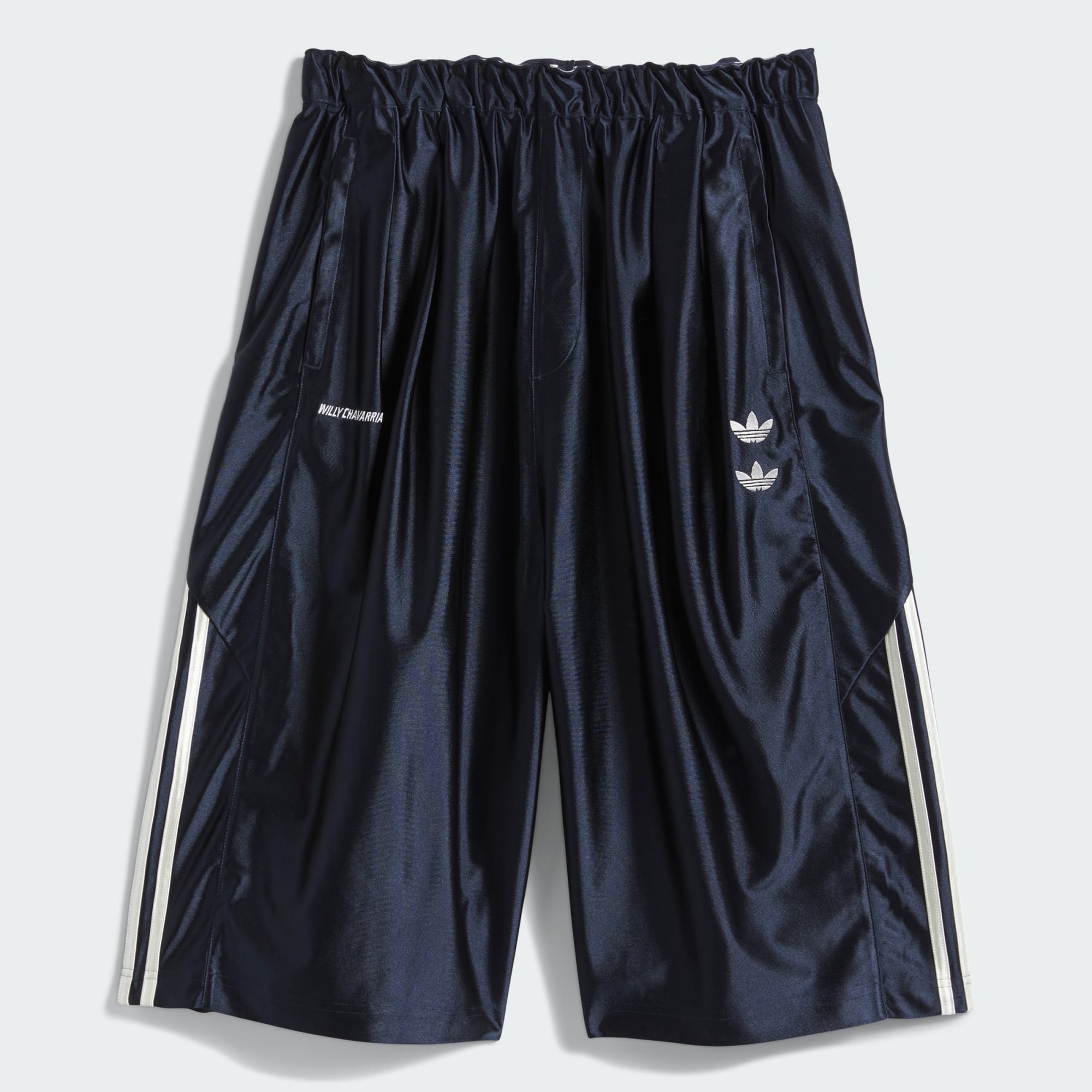 Šortky Chavarria Dazzle Snap jsou vyrobeny z lesklého třpytivého materiálu, který poskytuje výjimečné pohodlí. Střih s objemnějšími nohavicemi dodává moderní siluetu. Mezi funkční detaily patří elastický pas se stahovací šňůrkou, dvě boční kapsy na zip a patentky po stranách každé nohavice. Označení je provedeno vyšívanými dvojitými logy Trefoil na levé nohavici a vyšívaným nápisem „Willy Chavarria“ na pravé nohavici. Charakteristické 3 proužky adidas jsou aplikovány po stranách obou nohavic.