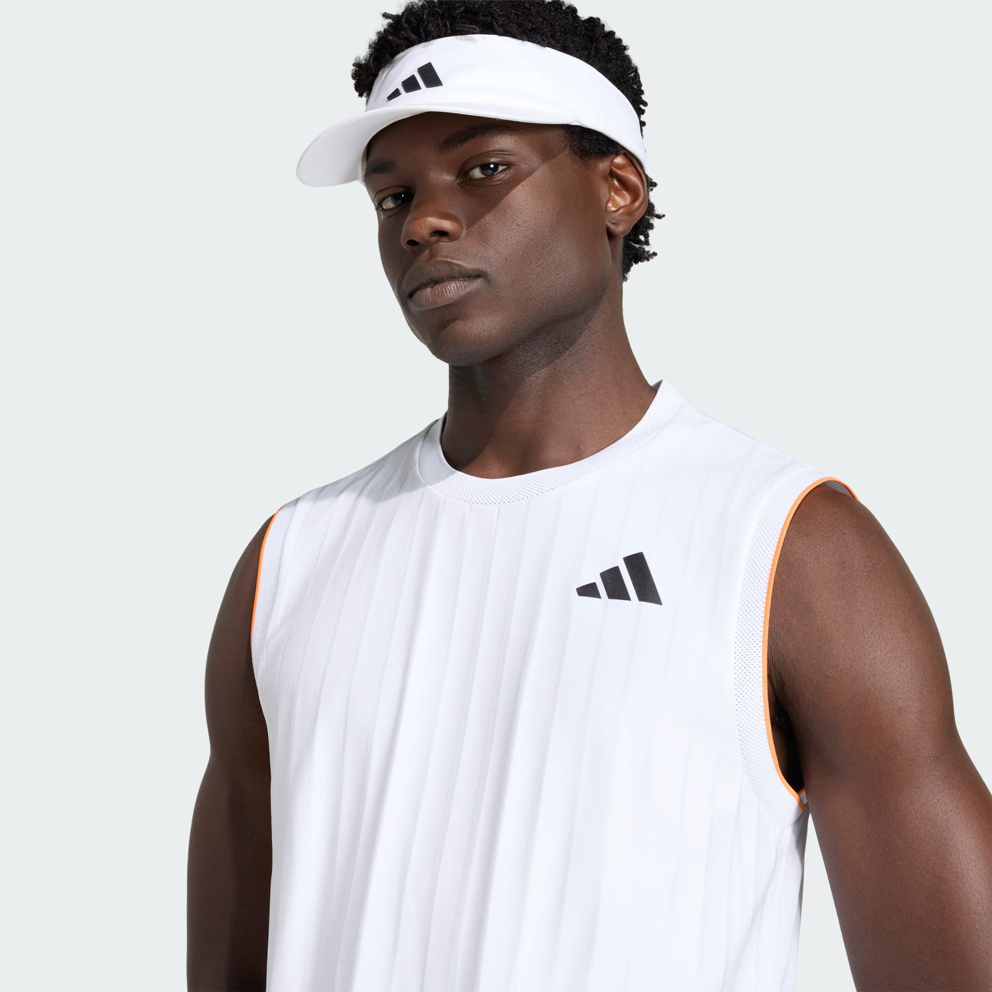 Triptych se dvěma záběry na tričko z nové kolekce Melbourne v bílé barvě. Fotografie středu je akční fotografie Felixe Augera Aliassimeho na kurtu, který je připraven podávat.