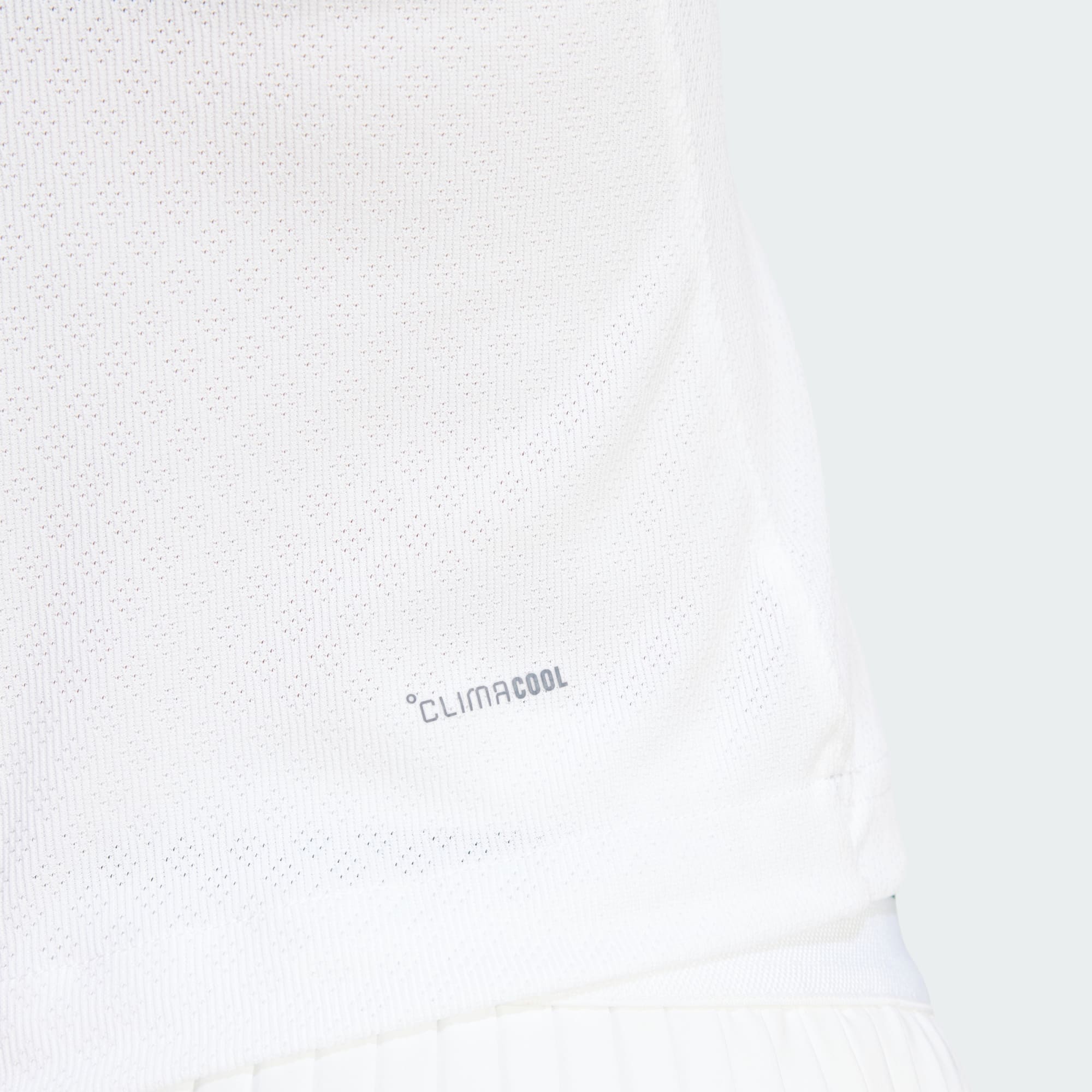 Na obrázku jsou vidět ruce, které se svírají na okraji bílé tenisové sukně, a na sukni je zdobí logo adidas. Na pozadí se vyjímá zelené tenisové hřiště.