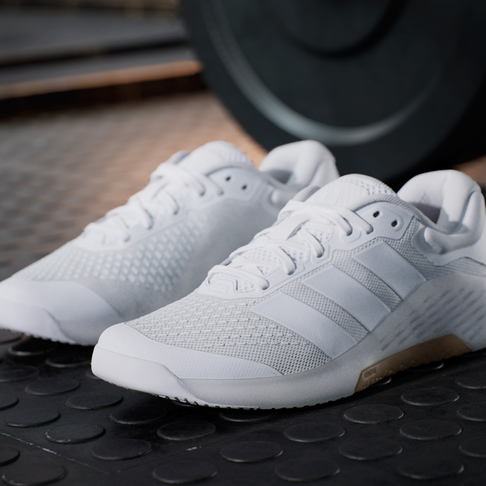 Video zachycující sportovkyni při vzpírání, skákání a běhu v nových botách Dropset 4 pro silový trénink.